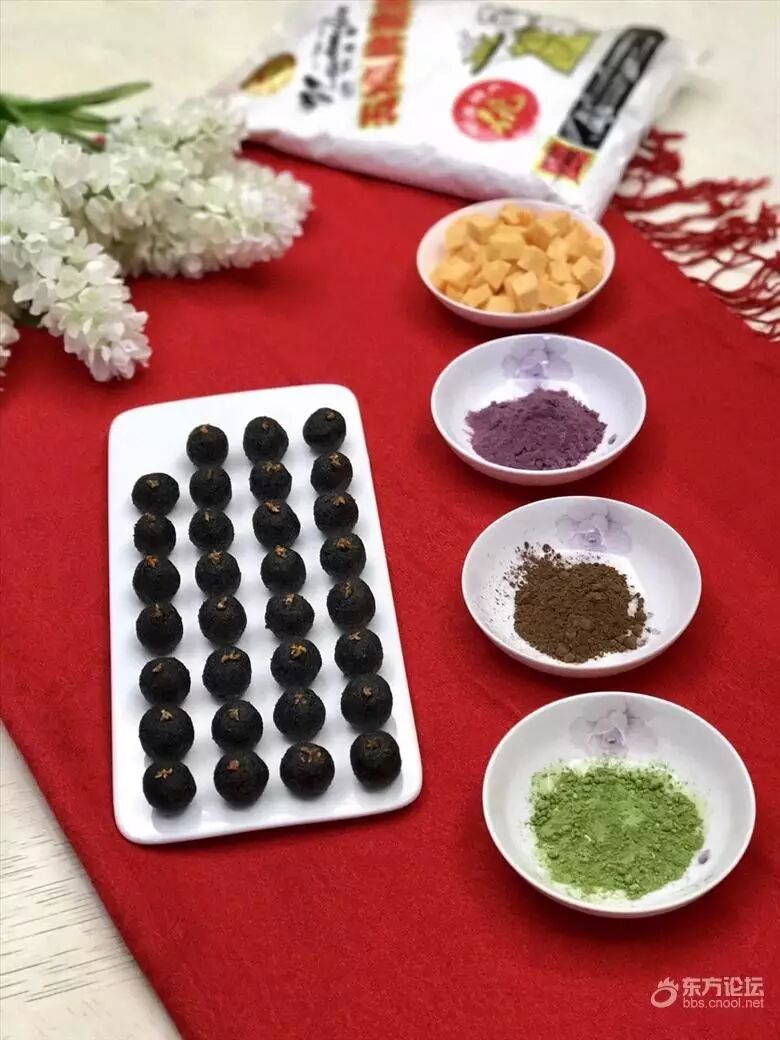 4、分别把抹茶粉、可可粉、紫薯粉与糯米粉混合均匀,再慢慢加入少许温水,和成各色面团。(这个面团量可以少点)