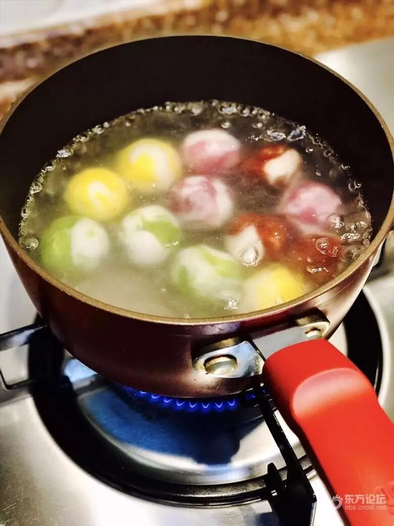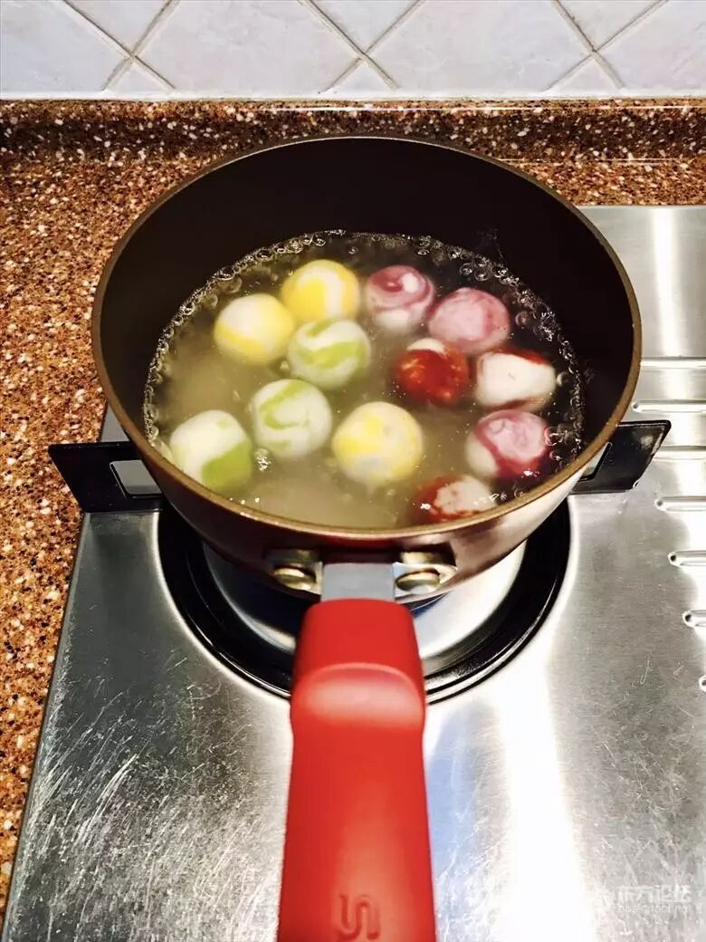 7、锅中倒水烧开,下入汤圆,大火煮至汤圆浮起后,用中小火再煮3-4分钟至熟透即可。