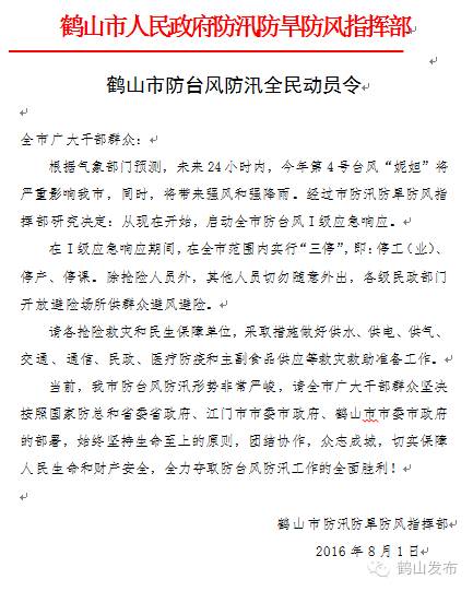 当前,我市防台风防汛形势非常严峻,请全市广大干部群众坚决按照国家防总和省委省政府、江门市市委市政府、鹤山市市委市政府的部署,始终坚持生命至上的原则,团结协作,众志成城,切实保障人民生命和财产安全,全力夺取防台风防汛工作的全面胜利!