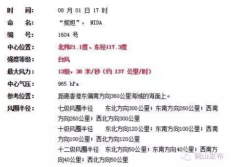 报料兄弟从鹤山市气象部门了解到,台风“妮妲(粤语发音同坦)”将于2日早晨正面袭击珠江三角洲,有可能穿过鹤山市境内,届时鹤山市将迎来一次强风暴雨降水过程。