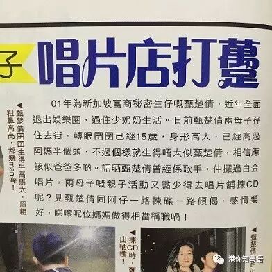 现年46岁,曾出演电视剧《我爱玫瑰园》的甄楚倩为新加坡富商秘密产子后便过着少奶奶的生活。近日被拍到与15岁的儿子一起逛唱片铺买CD。