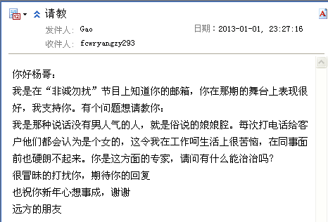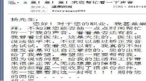 2008年的一天,我接到一个陌生女孩的声音,她说:“您好,您是杨老师吗?我是电视台的,请问您是做声音美容的?”我一听,第一反应就是电视台的一些教育栏目来拉广告的!因为最近老有做广告的来“要钱”,反正要钱没有。听是女声就聊多两句: