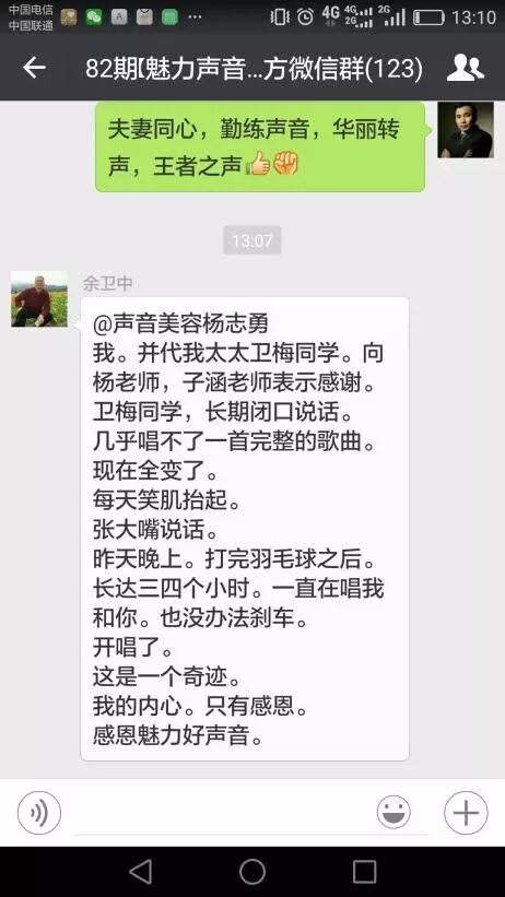 1)邓士雄(声音改变后改名:邓响亮)佛山美尔特涂料有限公司董事长。做过2次声带息肉手术,声带严重受损、声音严重嘶哑,平时讲话别人根本他听不出讲什么,还要整天向客户介绍、推广产品,痛苦万分。学习后,讲话不累了,声音也不怎么嘶哑了,唱歌也好听了,整个人乐呵呵的,业务蒸蒸日上,不到半年给老婆买了一辆80万奔驰。