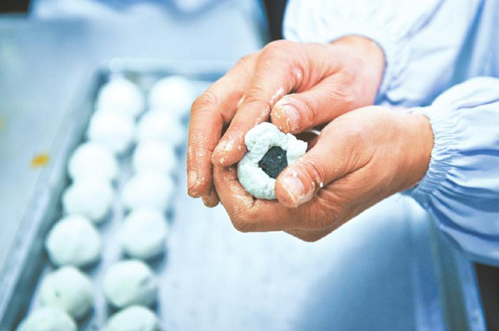 7.把汤园剂子包入馅,入锅煮熟即可。