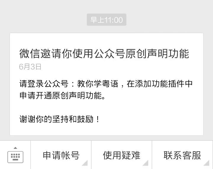 Simon有话说:教你学粤语今天被微信公众平台邀请使用原创申明功能,这个是代表Simon写的文章能申请原创保护。