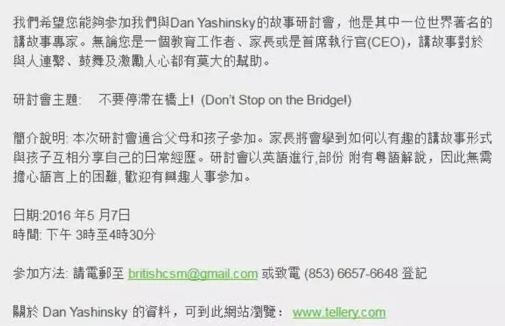 Dan 為著名之講故事大師,蜚聲國際,現特邀請他來澳門主持一場工作坊,讓參加者領略講故事之益處,機會難得,座位有限,報告從速,名額50名,額滿即止。此乃親子活動,家長連同子女報名優先取錄!