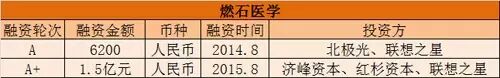 燃石医学在2014年8月获得北极光创投及联想之星6200万人民币的联合投资。2015年8月完成了济峰资本、红杉资本及联想之星的1.5亿人民币A+轮投资。