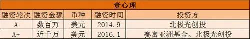 2014年9月,壹心理获得北极光创投的数百万美元A轮融资。2016年1月,其又宣布完成近千万美元A+轮融资。