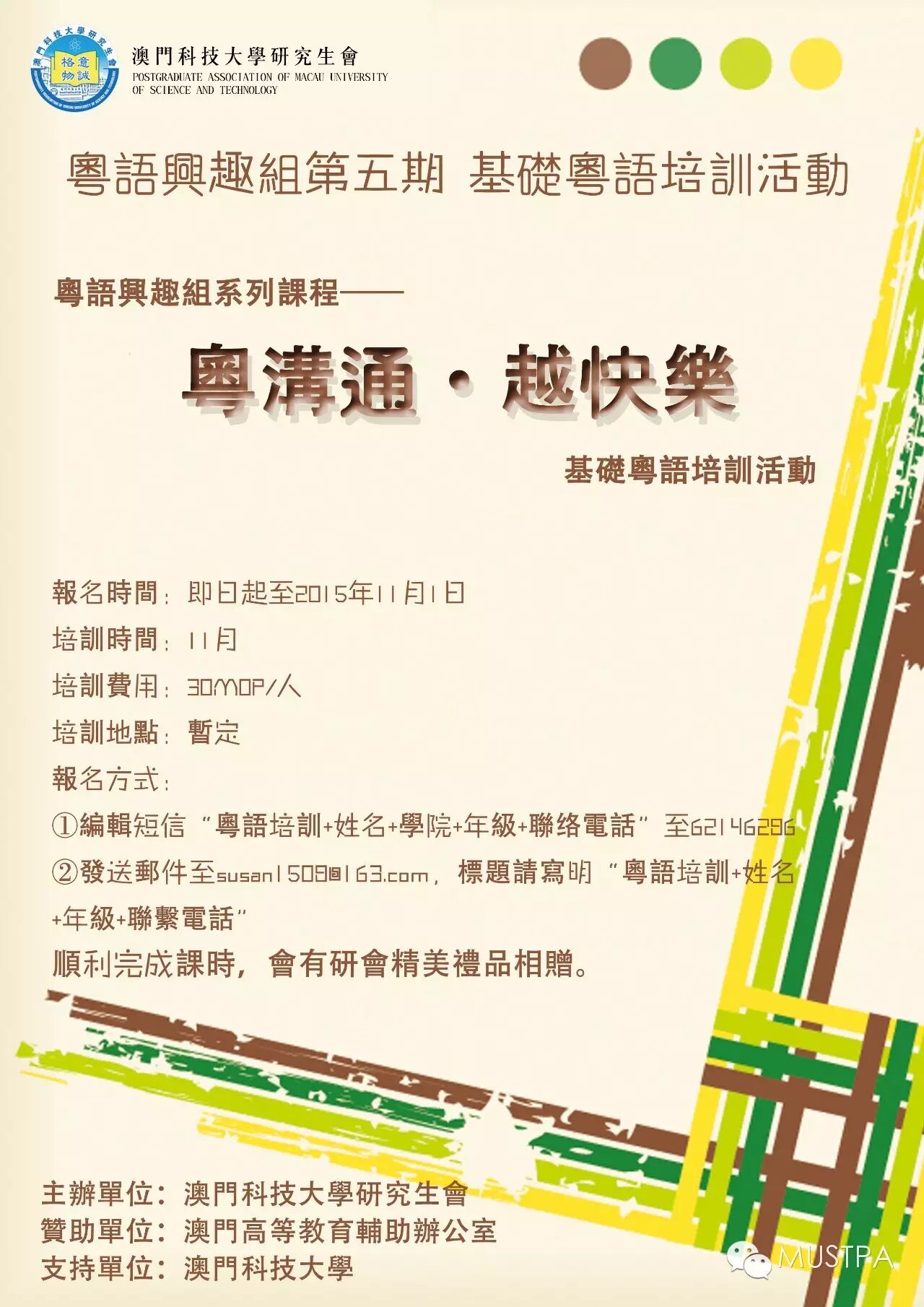 第五期粵語班開鑼啦!四節課讓你從零學起,從聽不懂到聽得懂就是那麼簡單~十一月的每個星期日我們來相會吧!報名費:30mop。報名方式:編輯姓名+電話+學院+學好發送到郵件1875746025@qq.com,短信66516598。