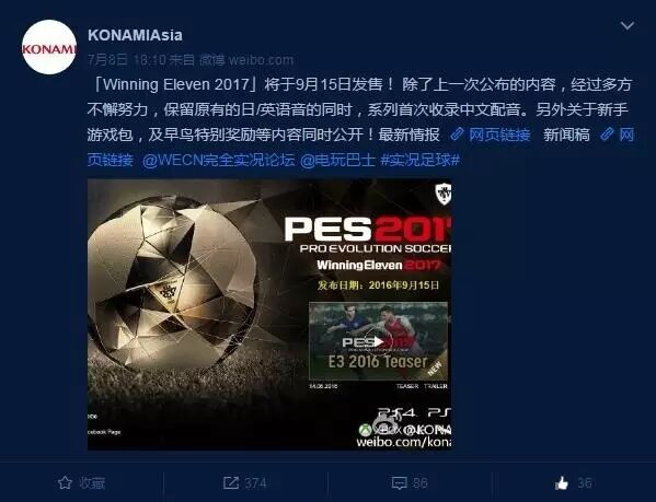 《实况足球2017》已经确认于2016年9月13日正式发售,登陆PC、Xbox One和PS4。虽然官方已在强调新游戏将继续在操作手感、画质上苦下功夫,但显然Konami也知道球队授权是《实况足球》最大的短板,因此想要在全球市场压过《FIFA》很难实现。所以Konami决定稳扎稳打,先从亚洲开始巩固自身的地位。继购买了亚冠、欧冠以及部分亚洲联赛版权之后,来自Konami官方的信息显示《实况足球2017》还将首次自带普通话和粤语解说,中国玩家可以无障碍体验游戏。事实上,在中国内地开放游戏主机销售之后,国外游戏厂商也已经开始更加重视这片新市场的发展。此前,《三国志13》也首次加入了普通话配音。