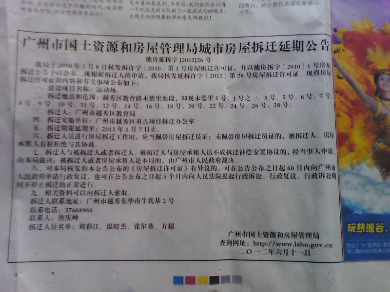 每个星期六日的《广州日报》,都有拆迁的公告,看到这些使人感到痛心!大家想想为什么拆迁的都是老城区?到底是为了改造还是为了什么?如果我成为富豪,就成立个开发公司,把那些拆别人房屋的房地产公司的控制人的祖屋拆了它,如果你不让拆,我们就请个临时工趁你出去买菜时拆了它,反正没人管得着,反正这些拆迁的批文是那么容易的取得?反正地块的烂尾谁也无须负责!现在这些拆迁的启示,受苦的只有被拆迁的广州本地人!