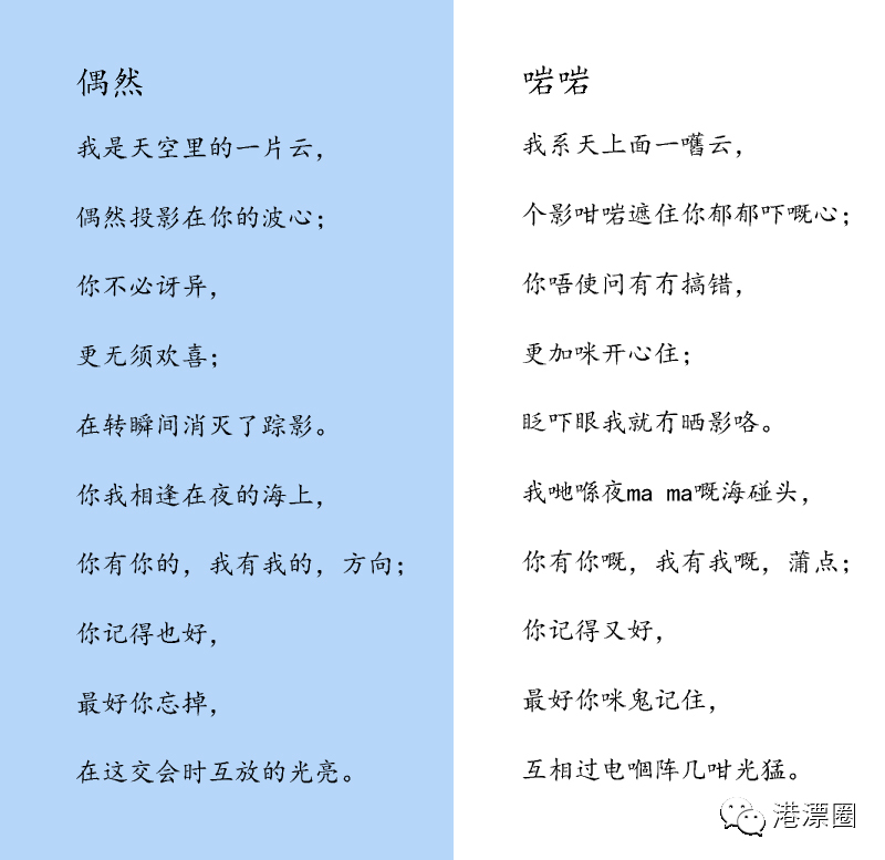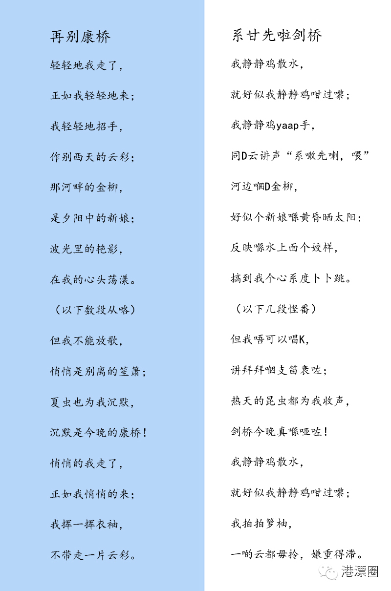 当年背徐志摩的诗,《再别康桥》可是必修曲目,没想到将徐志摩的作品翻译成粤语版竟然这么有喜感!“系咁先啦剑桥”生生读出了一种洒脱啊,所以检验你粤语水平的时候又到了,试试能不能全文标准的读出来吧?