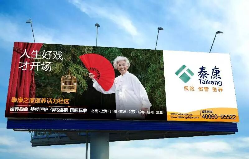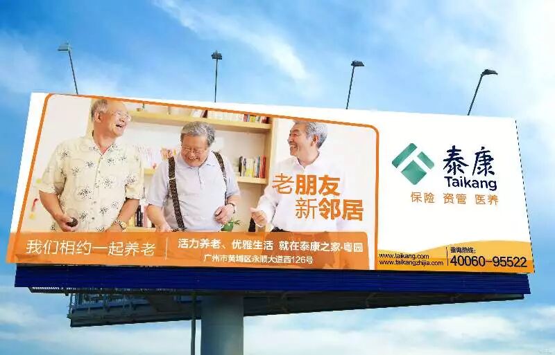 自10月20日起,泰康集团开启了全方位养老社区广告投放,陆续在燕园、粤园、申园、蜀园、楚园等八大园区所在地及辐射地区集体换装。
