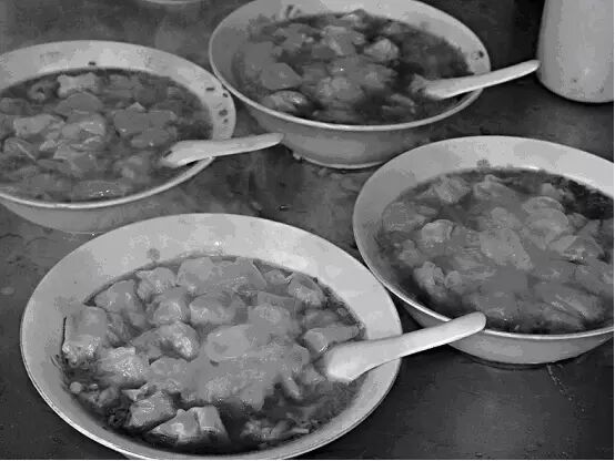 白豌豆粥:泰兴街头卖粥始于民国初年,据说那年来了一个里下河地区的中年人,姓名不详,人们皆唤他“巧儿”。此人于入夏时摇着小船来,中秋节后回去。每天下午2 点多上市,天黑了才收摊。他肩挑一副粥担子,前面一只泥炉,炉中以小段木柴为燃料,炉上搁锡锅,锅盖为两块。后面一只带抽屉的小木柜,内存碗筷。木柜上放着铜盆和毛巾,下面是敞口的大瓦罐,清亮亮的水能照见人影,是供食客就餐后净面洗手所用。在这些家当中,最引人注目的是盛粥的碗,由茶杯口粗的毛竹根制成,高有15 公分。客人眼看着滚烫的粥装进碗中,接到手后,却给人带来一种通体清凉的感觉。白豌豆粥的制作颇费时日,先要将上好的白豌豆用温水浸泡数日,与香糯米一齐投入铜锅中煮沸,再添加一点食碱熬成粥状。食用时,放入白糖。此时的白豌豆己糜烂如泥,无需咀嚼,舌头轻轻一抿,入口便化。不仅能解渴压饥,更有健脾理胃益气之药效,故而特受儿童和老年人喜爱。