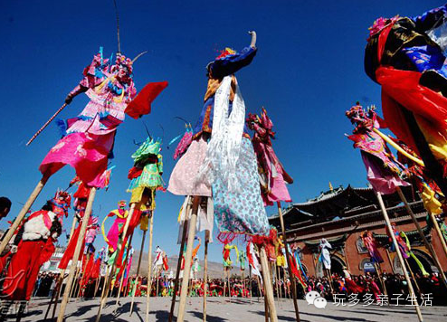 踩高跷是民间盛行的一种群众性技艺表演。高跷本属我国古代百戏之一种,早在春秋时已经出现。表演者不但以长木缚于足行走,还能跳跃和舞剑,高跷分高跷、中跷和跑跷三种,最高者一丈多。