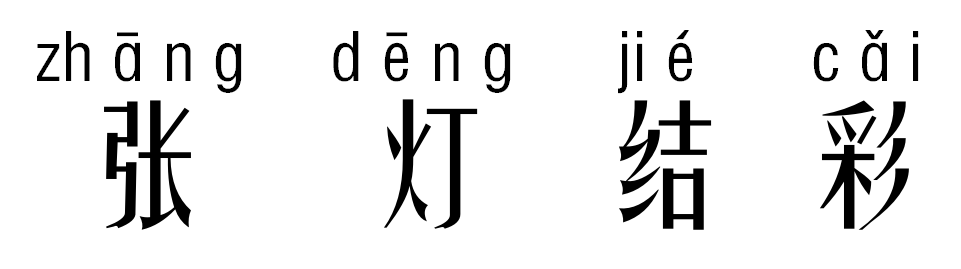 张,陈设、铺排;结,结扎,系。彩:彩绸。意思是挂上灯笼,系上彩绸。形容节日或有喜庆的事的繁华景象。