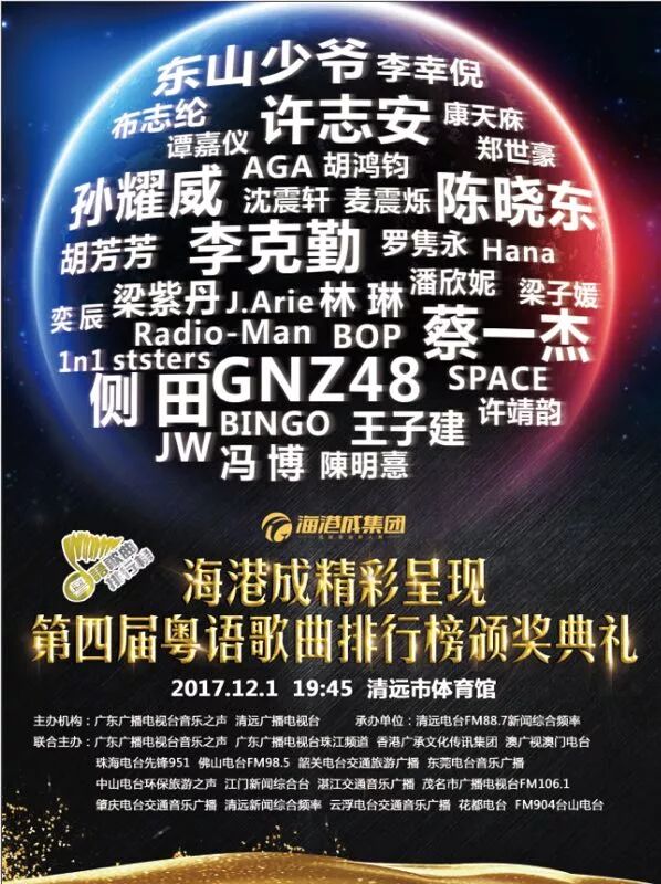 为促进发展粤港澳地区流行音乐文化、推动音乐人和歌手之间的交流,由广东广播电视台音乐之声、广东广播电视台珠江频道、香港广承文化传讯集团、澳广视澳门电台、珠海电台先锋951、佛山电台FM98.5、韶关电台交通旅游广播、东莞电台音乐广播、中山电台环保旅游之声、江门新闻综合台、湛江交通音乐广播、茂名市广播电视台FM106.1、肇庆电台交通音乐广播、清远广播电视台FM88.7新闻综合频率、云浮电台交通音乐广播、花都电台、FM904台山电台共同呈现的第四届粤语歌曲排行榜颁奖典礼,将于12月1日在清远体育馆盛大举行。