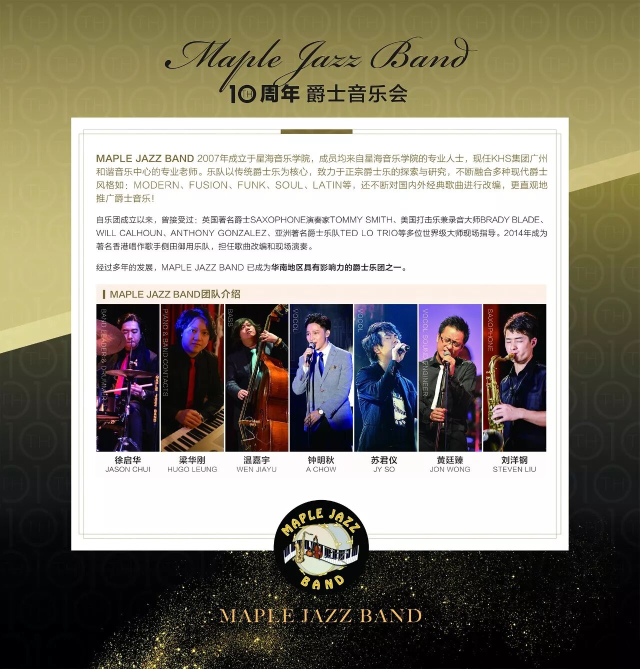 MAPLE JAZZ BAND 2007年成立于星海音乐学院,成员均来自星海音乐学院的专业人士,现任KHS集团广州和谐音乐中心的专业老师。