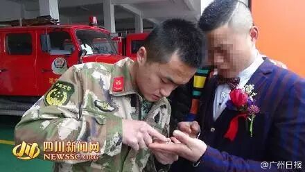 【新郎婚礼婚戒卡手指 消防员帮脱困】“你愿意娶XX为妻吗?……”2月1日,在四川遂宁一场新婚庆典上,司仪一声祝福后,新娘为新郎带上新婚戒指,但这枚戒指却闹起“别扭”来,牢牢地套在新郎手指上数小时,无法被取出,致新郎手指被勒得红肿、充血,不得不找消防帮忙摘戒指。