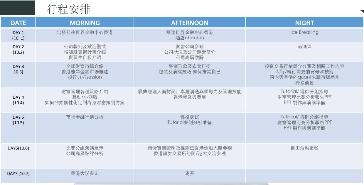 项目由职业经理人培训,培训主要由企业实际操作业务、金融行业面面观、投行分享、量化交易、财富管理报告大赛等重要元素构成。该项目既是对商业和管理学的实践延展,也是对跨国实证考察。该项目旨在丰富学员们的阅历,增长学员们的见识,在实习工作的过程中能对自己未来的人生有一个清晰的规划和对未来发展方向的探索。同时也能为一些学员体会到香港生活的多样性,丰富性。