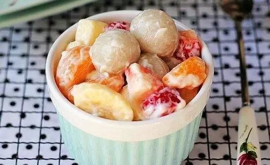 2、汤圆捞出后,放入凉水中过凉一下然后捞出,香蕉切块,苹果和草莓洗净,分别切块,蜜桔去皮摘去桔络,把处理好的水果放入容器中,倒入汤圆,挤上沙拉酱,拌匀即可。