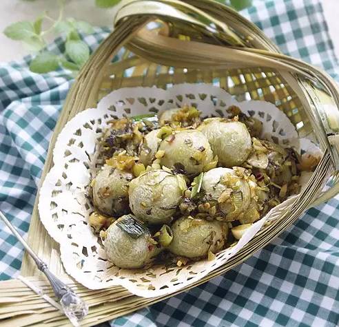 1、姜切粒、蒜切片、蒜苗切小段,红油、汤圆备好。锅中坐油,油温五成热时关火,倒入汤圆。汤圆炸至稍变色有破皮即刻捞出放入盘中。炒锅上火下入姜、蒜、蒜苗爆香。