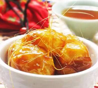 2、锅中留少许底油,放入冰糖和蜂蜜用中火熬成金棕色较黏稠的糖浆,放入炸好的汤圆迅速翻炒,直至糖浆均匀地裹在每粒汤圆上迅速装盘,趁热食用。