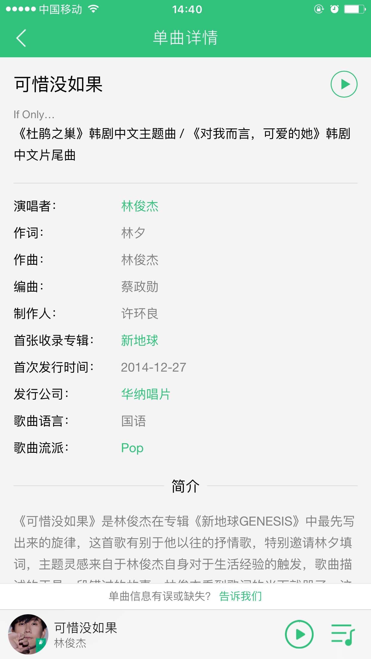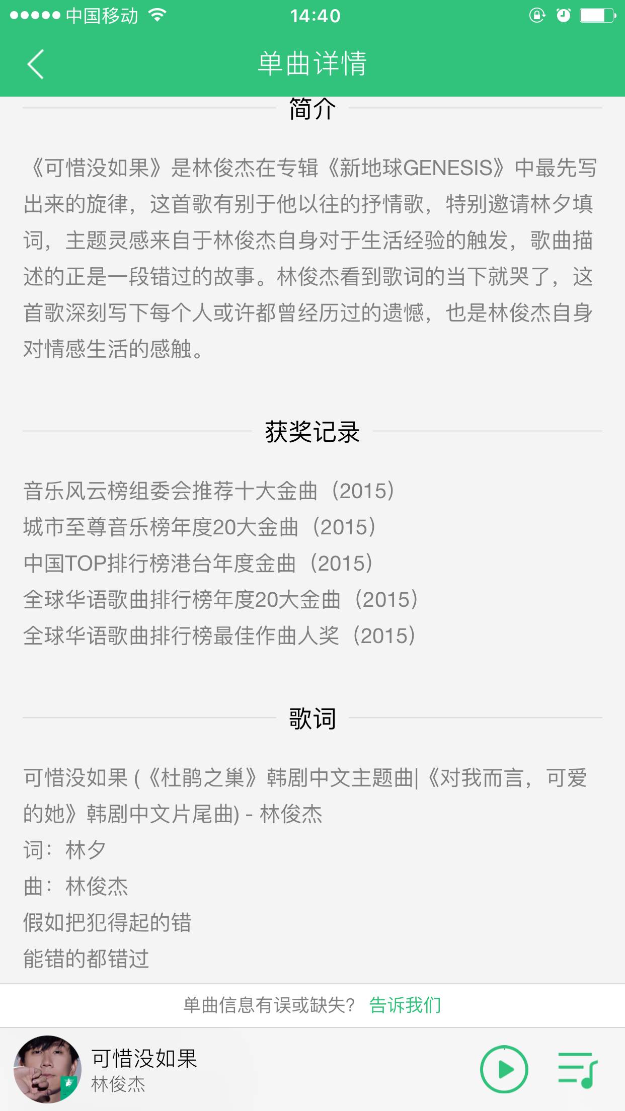QQ音乐编务除了一直致力提供最新最快最高品质音乐外,还不断丰富完善歌曲延伸信息,像2016年上线的单曲详情资料就是其中一个心血结晶,这些宝贵的资料可都是小编日以继夜翻查各大权威网站收集回来的呢,仅仅下载一个音乐APP,就可以一边听歌,一边了解歌曲背后的故事,是不是绝对值满分?