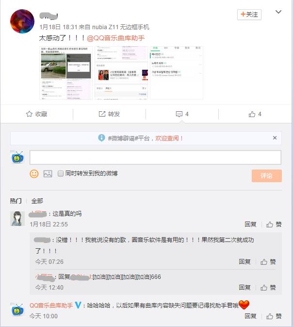 2016年,小编在为了更贴心的用户关怀体验的路上马不停蹄。微博上,我们有暖心的QQ音乐曲库助手;手机端上,我们有软萌的QQ音乐小秘书微信公众号;在QQ群:165959778里更是聚集了一批音乐爱好者。妈妈再也不用担心我找不到歌啦!
