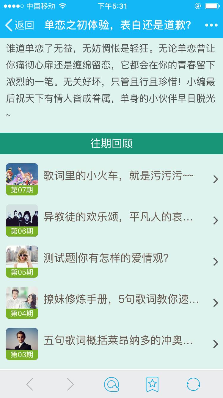 负责翻译歌词的几位编辑为帮助希望提高外语水平和音乐知识的童鞋,去年倾情编写了十期外语歌词学习专题。从韩国歌谣界魔性歌曲盘点,到二次元歌曲背后的故事,到李奥纳多的“冲奥”历程,都一一用相应的外语歌词来概括描写。专题内容通俗接地气,又包含了不少知识干货,可读性高。难怪乎有童鞋调侃说:明天就翻译专业考试啦,求QQ音乐翻译体上身~