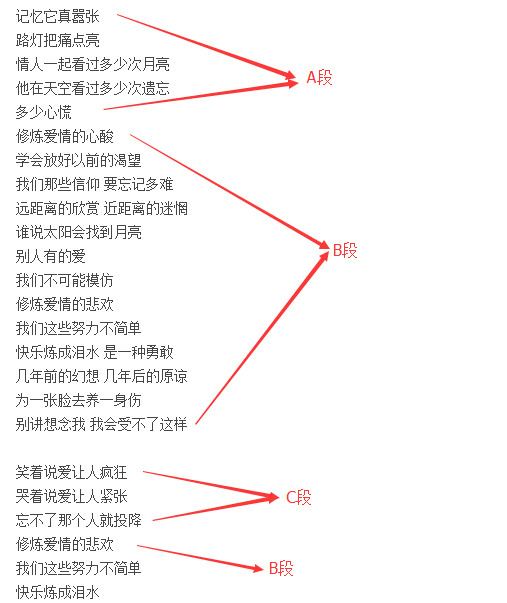 C段发展段是一段B到另一段B中间的一部分,一般是给两个B段一个缓冲和过渡,起到发展作用。很明显的栗子《修炼爱情》中 两个B段中间的“笑着说爱...哭着说爱.....忘不了那个人就投降”这一段就是发展段。