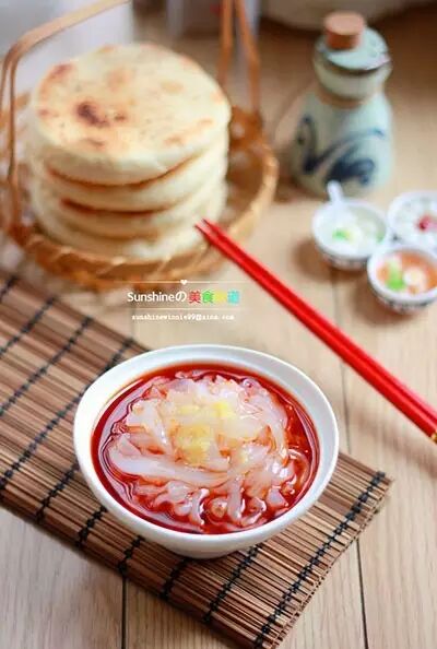 8、用凉粉刮刮成细丝,加入自己喜欢的调味,灌进锅盔里就可以享受美味了。
