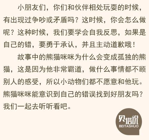 小朋友们,熊猫咪咪最终意识到自己的错误,并且主动承认、改正错误,所以,大家又愿意和他一起玩了!所以我们也要学会自我反思,如果是自己的错,要勇于承认,并且主动道歉哦!