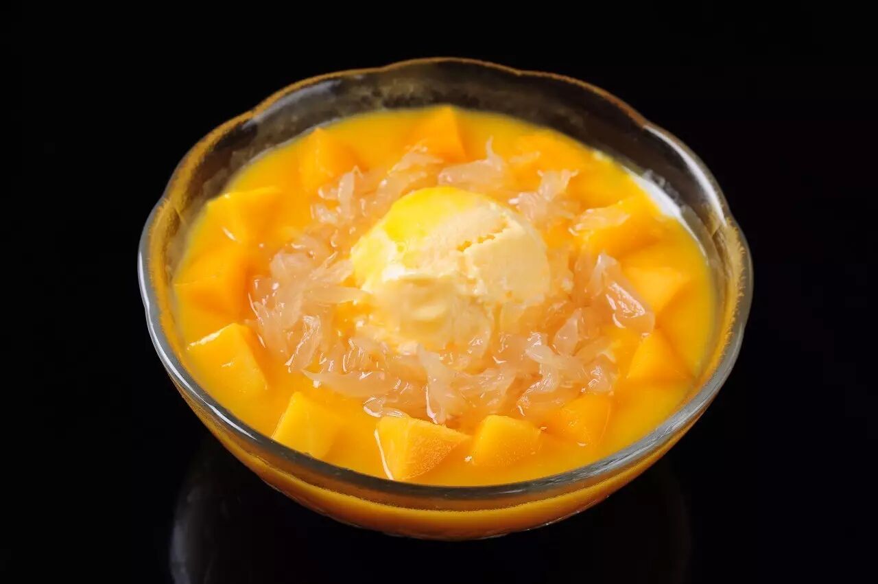 杨枝甘露,混合了芒果果粒、新鲜的芒果汁、柚子肉、椰汁和西米,再加上一球芒果冰淇淋,清凉香甜,堪称完美。