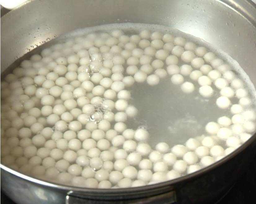 1、锅里倒入适量的水煮沸,再倒入小圆子