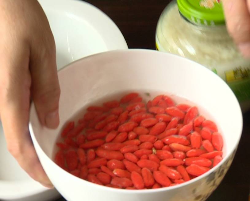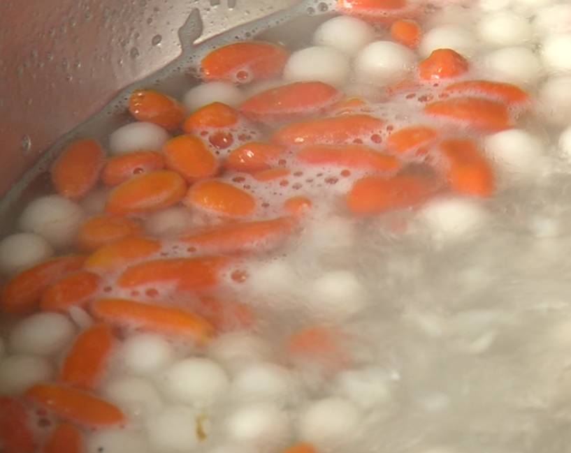 2、等小圆子浮上水面后,再放入酒酿、枸杞、冰糖就行了