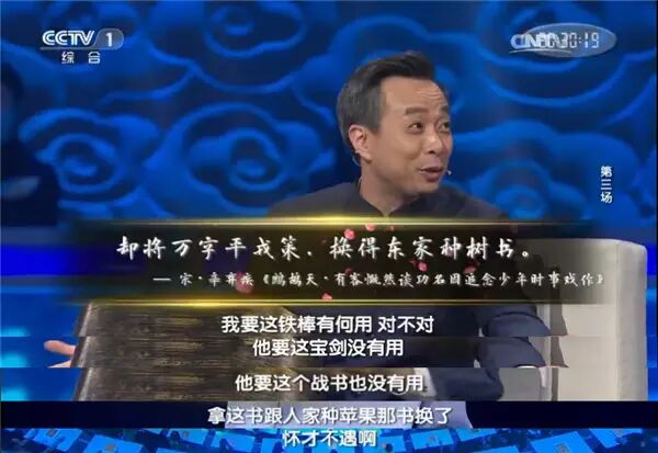 而真正让康老师成为“男神”的,是他还自带萌点。讲到辛弃疾的“却将万字平戎策,换得东家种树书”时,他说,辛弃疾的心情,就像歌里唱的“我要这铁棒有何用”,怀才不遇。