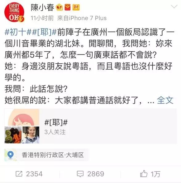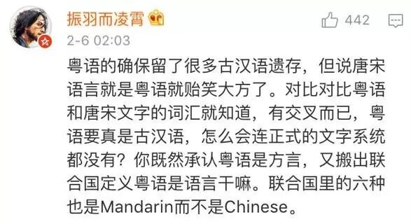 不过,陈小春这条繁体字写作的长微博,迅速引发了网友们的热议。有人认为陈小春举得例子不妥,粤语虽然保留了很多古汉语遗存,但不代表唐宋的语言就是粤语;也有网友表示支持,认为粤语确实具有深厚的历史与文化底蕴。