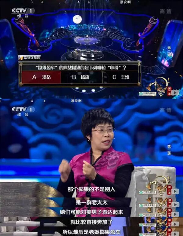 讲到“掷果盈车”的典故时,蒙曼说,潘岳长相俊美,坐车走在街上时,一群老太太奔放地表达了对他的喜爱,往他的车里疯狂扔水果