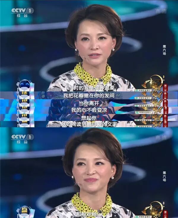 第六期时,一位孩童清脆地唱着《春夜喜雨》,父亲轻轻地和着,董卿被这一幕感动,眼里闪着泪花,随口念出了叶赛宁的《我记得》。“当时的我是何等温柔,我把花瓣撒在你的发间,当你离开,我的心不会变凉,想起你,就如同读到最心爱的文字,那般欢畅。 ”