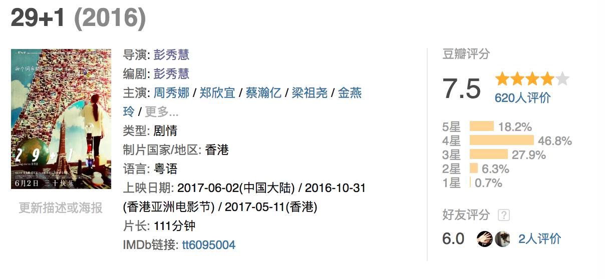 前几天上映的港片《29+1》可能是最近档期里的一颗遗珠,因为之前在香港看过,我的印象还不错。虽然后面郑欣宜的部分略有点过,但是前面周秀娜的部分真的还不错,我看的时候,身边有个香港女生就哭得稀里哗啦的