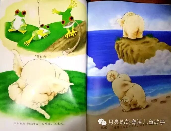 接下来,小乌龟、小兔子、小野猪都请邦邦帮助它们过河,并且大家都夸赞它的长鼻子真厉害。和邦邦比本领的青蛙听到了,一点都不服气,决定自己过河,不用邦邦的帮助。空中一只鹭鸟这时突然冲下来,邦邦看见了,赶快用长鼻子卷起青蛙救上岸。青蛙感激地说:“邦邦,谢谢你,你的鼻子真厉害!”