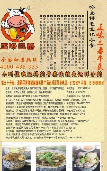正味三番牛杂是拥有自己独门配方的清远自创品牌牛杂店。我们的汤底均采用大量的新鲜牛骨加上自己配制的独门配方用猛火熬制而成,这不是一般的牛杂,这是连汤都可以喝,令人味蕾跃动的牛杂。短短成立二年多,已拥有五十多间分店,遍布到英德市,深圳市,吉林省等地方。我们大胆地把传统的街边小食搬入店面,时代的变迁,但有一种老味道从未被改变,“三番”的秘方是由一位连续三代做牛杂的老师傅调配而成。传承了80年的老味道,把旧时代浓郁的牛杂味飘香至今,依然保持了牛杂浓香的原汁原味,小时候我记得的牛杂味就是这样子的。