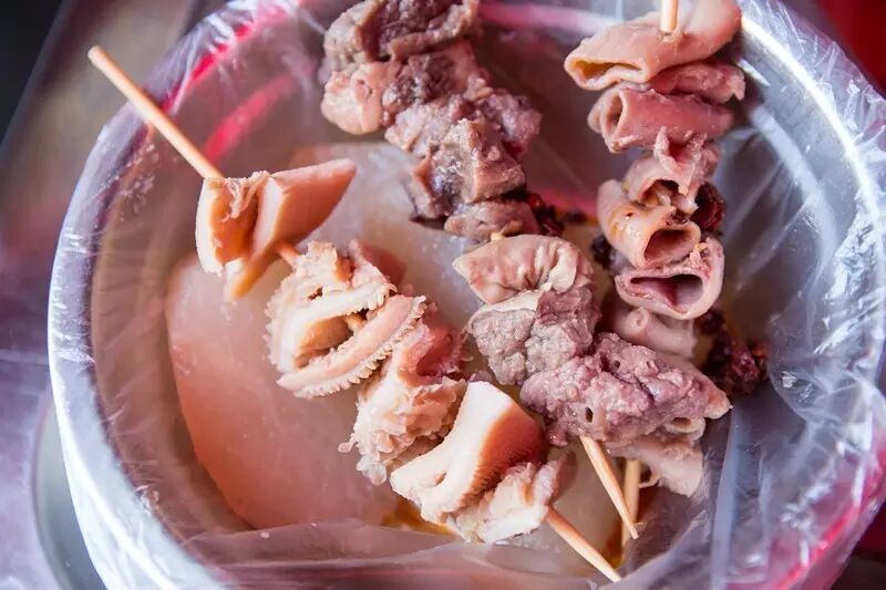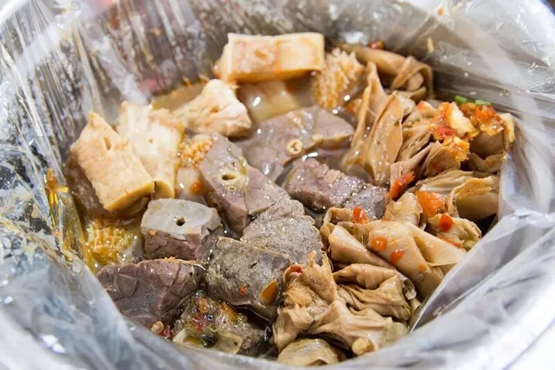制作好的牛杂,必须有新鲜的原料,老板娘每天凌晨赶到菜市场,为了挑选最新鲜的食材,制作成秘制的“英式美味”。将邋遢的牛下水制作成精美的食材,必须不能忽视清洁这一环,老板娘保证她家卖出去的东西一定是自己也放心吃得下的!把市场淘到好料去杂质去油腻,数十斤原料最终只会剩下不足十斤的食材,所以出售的串串都有质量~!
