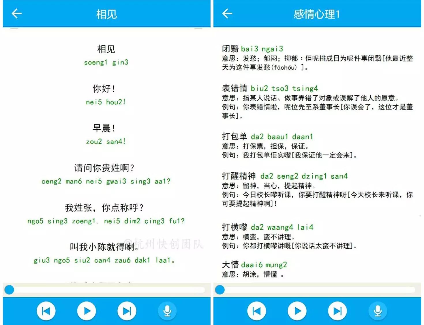 用户可以先从基础的粤语九声音调表等基础发音学起,循环渐进到粤语词汇、常用语和情景对话等进阶模块,每个模块都有文字和发音双重提示,确保用户学到位。