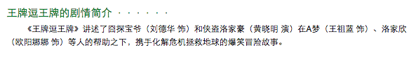 《王牌逗王牌》讲述了囧探宝爷(刘德华 饰)和侠盗洛家豪(黄晓明 演)在A梦(王祖蓝 饰)、洛家欣(欧阳娜娜 饰)等人的帮助之下,携手化解危机拯救地球的爆笑冒险故事。