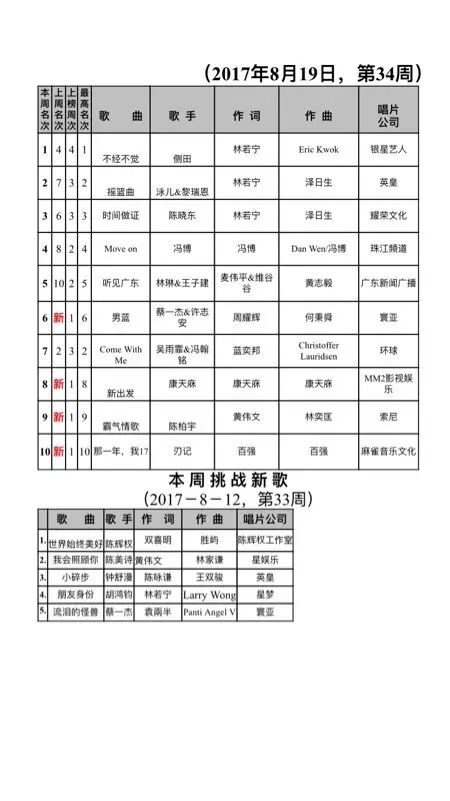 >粤语榜丨2017粤语歌曲排行榜第三十四周成绩单:侧田夺冠!