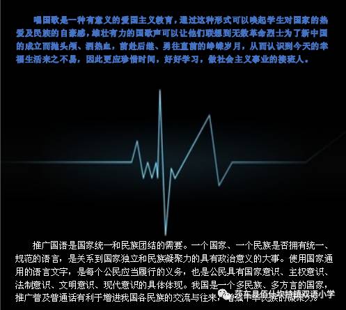 通过这次的“学国语、唱国歌”比赛活动,增强了我校师生的爱国主义精神,重新了解了我国艰难的建设历程,明确了如今的生活来之不易,更提醒了我们:不忘党恩情,永远跟党走!