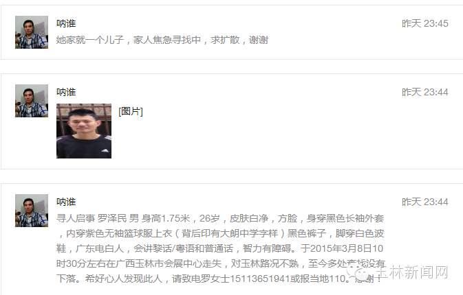 这是玉林新闻网微信平台收到微信网友呐谁的寻人信息,如果大家有看见麻烦和罗女士联系,电话15113651941。或报当地110。