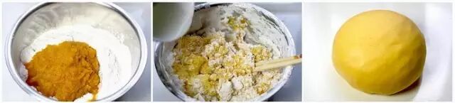 2.澄粉加入30克刚煮开的水用筷子搅拌,待手温揉成面团,南瓜蒸熟
